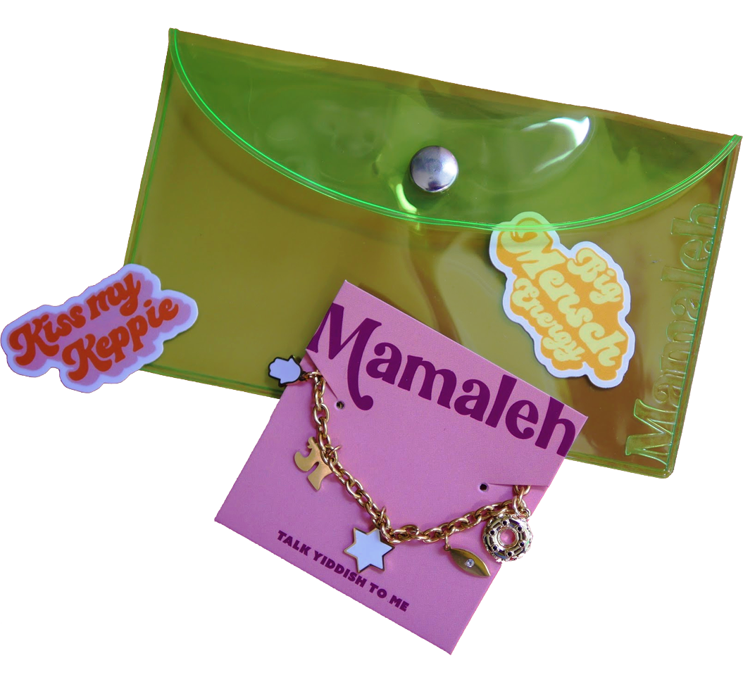 One reusable Mamaleh gift pouch includes four Yiddish stickers.